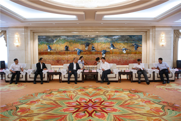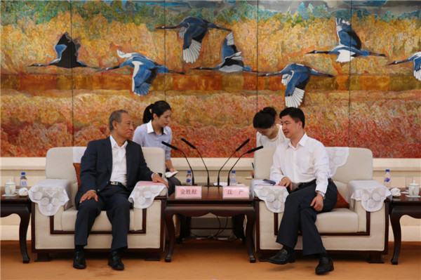2015年7月28日,副省长庄严会见韩亚银行前行长、韩亚金融集团前会长金胜猷一行。省外办副主任郑刚等有关厅局负责人参加会见。